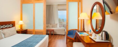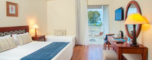 Die familienfreundlichen Zimmer laden Sie zu einem unbeschwerten Aufenthalt am Ionischen Meer ein. Das üppige Grün der Bäume, Palmen und Liegewiesen und das strahlende Blau der Poolanlage und des Meeres prägen Ihre Aussicht von der Terrasse oder dem Balkon.