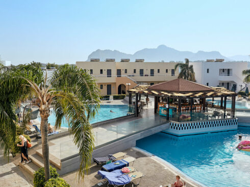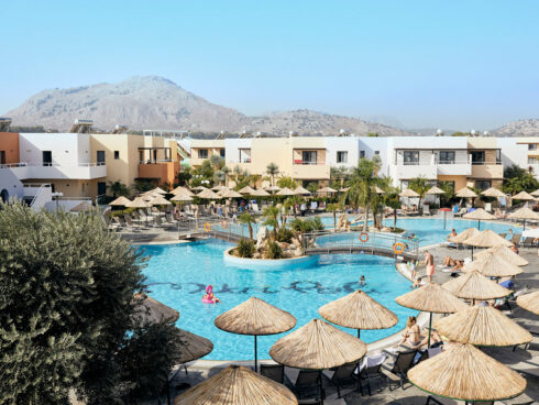 Kolimbia – Außerhalb des Ortes Kolimbia, ca. 150 m vom Kiesstrand entfernt, der durch eine kleine Straße vom Hotel getrennt ist. Badeschuhe sind empfehlenswert. Der Ortskern mit Geschäften und Tavernen ist in ca. 500 m Entfernung. Bis zum malerischen Ort Lindos sind es ca. 27 km, gute Linienbusverbindung. Transferzeit: ca. 40-80 Minuten.