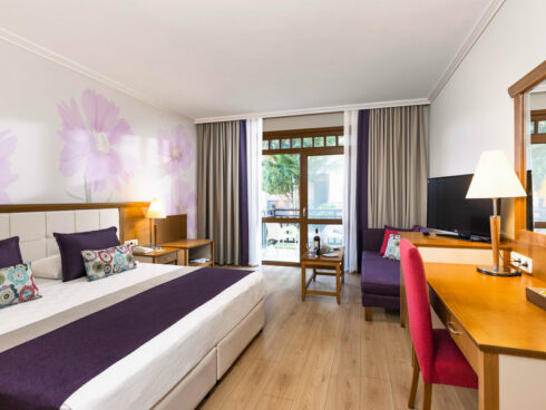 DZX2 – Doppelzimmer, Nichtraucherzimmer. Poolseite, Gartenblick, ca. 28 m², letzte Komplettrenovierung 2016, letzte Teilrenovierung 2017, Gesamtanzahl der Räume in diesem Zimmertyp: 1, Aufteilung wie folgt: kombiniertes Wohn-/Schlafzimmer, 3 Einzelbetten, 1 Schlafsofa, Babybett: ohne Gebühr, Anfrage nicht notwendig, Klimaanlage: ohne Gebühr, individuell regelbar, kalt, warm, Fußboden: Fliesenboden, Laminat, Safe: ohne Gebühr, Wasserkocher, Minibar: gegen Gebühr, Softdrinks: gegen Gebühr, Wasser: ohne Gebühr, Telefon, Internet: WLAN/WiFi: ohne Gebühr, Fernseher: Flatscreen, im Wohnbereich, deutsches Programm, Sat-TV, Dusche, WC, Föhn, Kosmetikspiegel, Balkon oder Terrasse: mit Sitzgelegenheit.