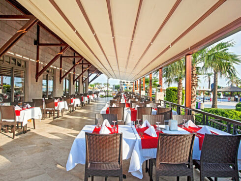Kizilagac / Manavgat – In direkter Lage nur wenige Schritte entfernt am Sand-/Kiesstrand gelegen (im Flutsaum kieselig). Nach nach Manavgat ca. 14 km. Side erreichen Sie nach ca. 19 km. Shuttlebus nach Manavgat und Side wird angeboten (tageweise und gegen Gebühr). Transferzeit ca. 1 Stunde 20 Minuten.