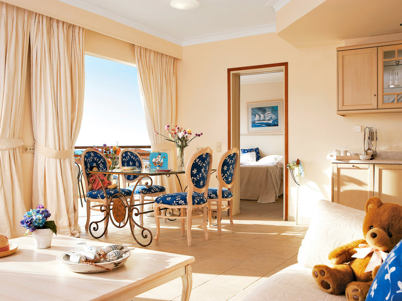SUX1 – Casa Marina Fam Suite Pool Garden View, Suite. Gartenseite, Straßenseite, Poolblick, Gartenblick, ca. 45 – 48 m², Gesamtanzahl der Räume in diesem Zimmertyp: 2, Aufteilung wie folgt: kombiniertes Wohn-/Schlafzimmer, 1 Schlafzimmer, Babybett: ohne Gebühr, Anfrage nicht notwendig, Klimaanlage: individuell regelbar, zentral gesteuert, Fußboden: Fliesenboden, Safe: ohne Gebühr, Bügeleisen, Bügelbrett, Kochnische, Kühlschrank, Backofen, Kochplatte, Mikrowelle, Geschirrspüler, Wasserkocher, Minibar: ohne Gebühr, Softdrinks, Telefon, Internet: WLAN/WiFi: ohne Gebühr, Fernseher: im Wohnbereich, im Schlafzimmer, deutsches Programm, Sat-TV, CD-Player, Badewanne, WC, Föhn, Balkon oder Terrasse: mit Sitzgelegenheit.
