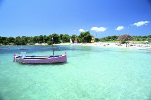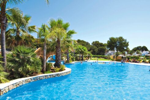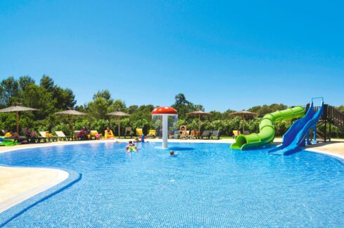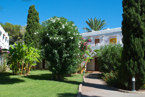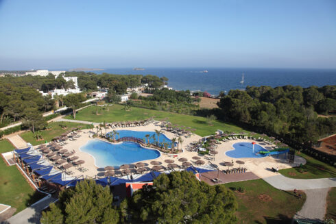 Ein einmaliges Urlaubserlebnis erwartet Sie in der wunderschönen Bucht von Santa Eulalia. Die Anlage liegt ruhig inmitten eines großen Pinienwaldes und je nach Lage des Zimmers gelangen Sie nach 200 – 400 m zum öffentlichen flach abfallenden Sandstrand (leicht kieselig). Am Strand stehen Liegen und Sonnenschirme bereit (Fremdanbieter, gegen Gebühr). Der Naturstrand liegt von den Wohnbereichen je nach Lage der Appartements ca. 200 bis 400 m entfernt. Die 315 Zimmer (Appartements) verteilen sich auf einer Fläche von ca. 70.000 m².